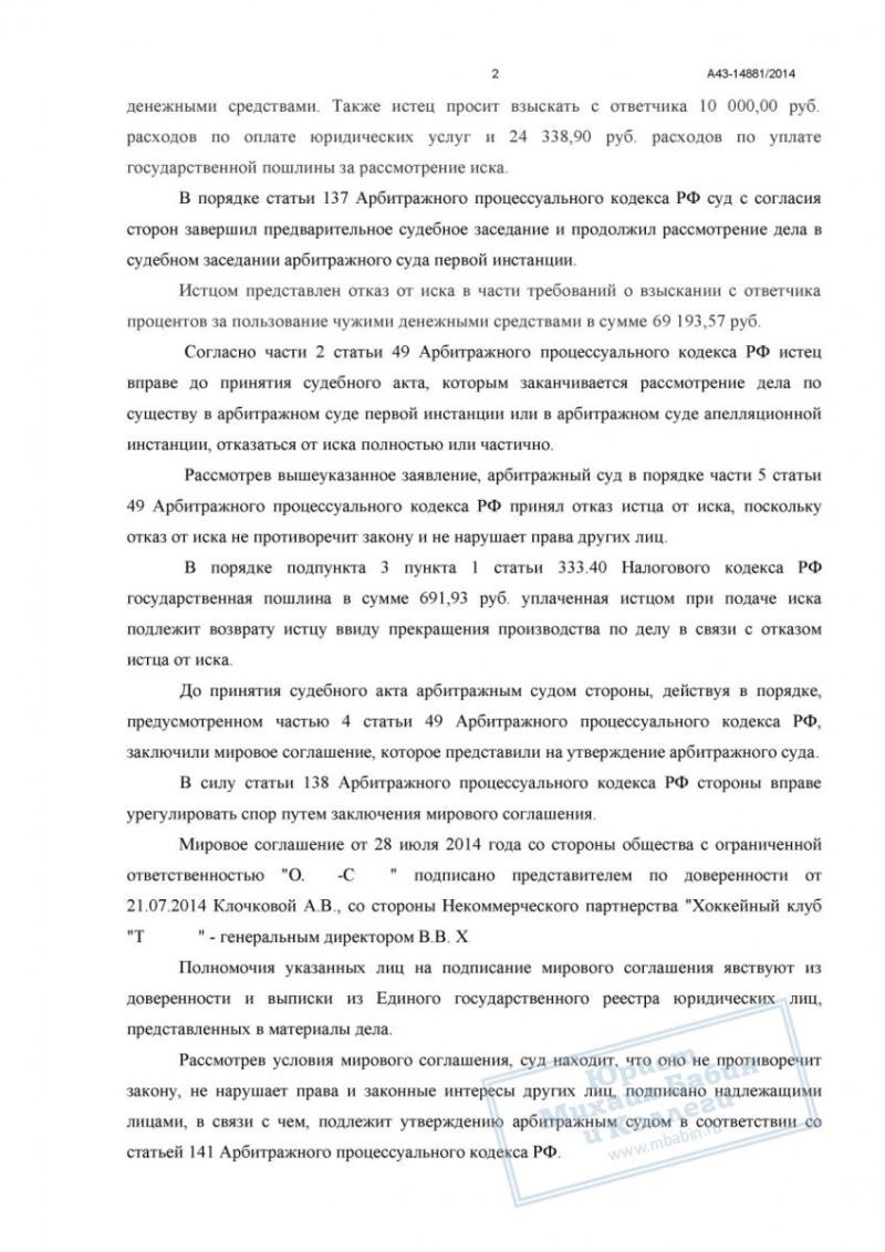 Руководство «О-С» обратилось за помощью в нашу коллегию. Адвокат, работающий в сфере b2b, взял на себя проведение переговоров между сторонами. В результате разногласия были устранены, хоккейный клуб выплатил всю причитающуюся сумму «О-С», а судебное дело закончилось мировым соглашением.